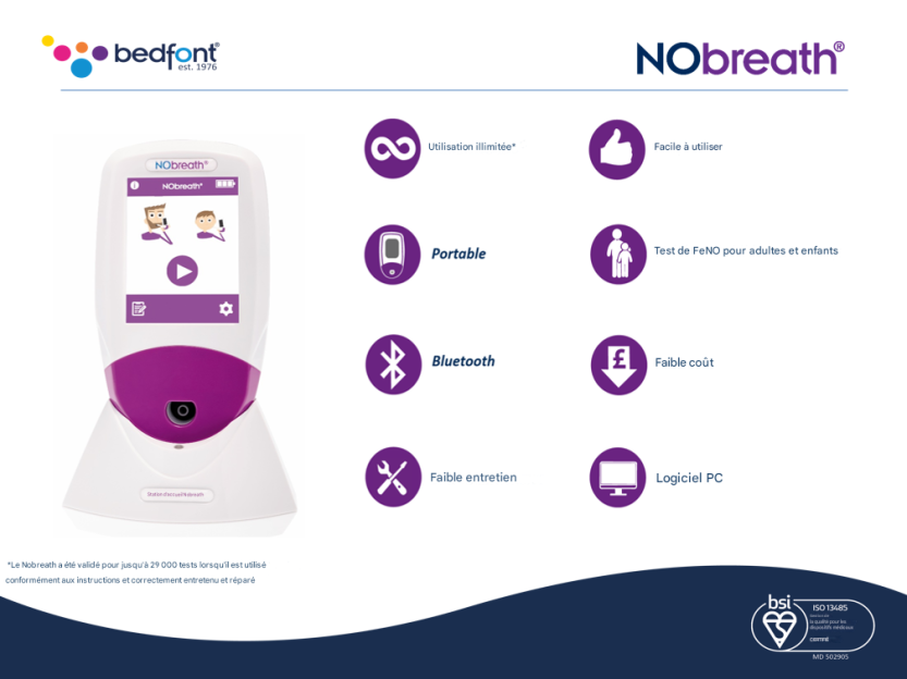 Le NObreath est un analyseur de la FeNO qui peut être utilisé pour mesurer l'inflammation des voies respiratoires pour le traitement et le diagnostic de l'asthme. Recommandé par le NICE et conforme aux directives ATS et ERS, le NObreath rend la surveillance de FeNO rapide et facile et il est complètement non invasif, avec la capacité de surveiller l'inflammation des voies respiratoires chez les patients adultes et enfants. De plus, le mode de surveillance ambiante vous permet de vérifier les niveaux ambiants de NO.
